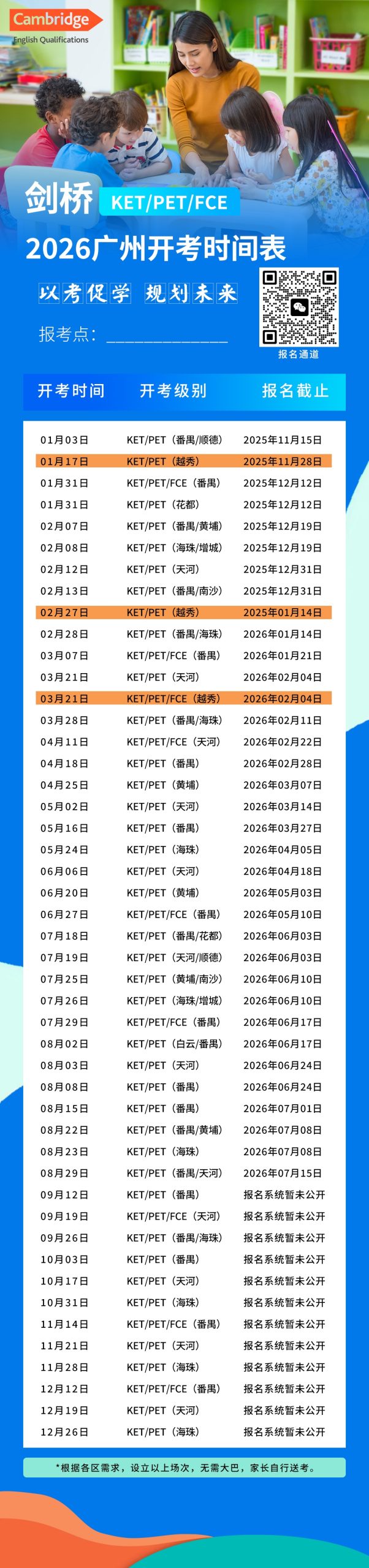 2026年广州剑桥英语KET/PET/FCE考试时间安排,广州剑桥KET报名入口 AR阅读助手 考试公告 1 分钟阅读 剑桥英语证书考试-CEQ(Cambridge English Qualification)是由剑桥大学英语考评部研发的一套专门针对英语为非母语人士的系列英语等级证书,被广泛应用于英语等级认证、出国留学和工作等的英语能力证明,受到全球范围内众多学校、机构的广泛接受和认可。 2026年广州地区剑桥英语KET/PET/FCE/CAE/CPE考试时间已更新,计划备考KET/PET/FCE的考生,根据自身水平情况提前了解好考试时间,合理规划学习安排! 如需报名,请扫下方二维码联系考务老师咨询报名! 广州FCE考试 广州KET考试 广州PET考试 AR阅读助手 为青少年提供优质学习资源,英文阅读能力测评以及剑桥体系的学习资源服务。 TA的主页 上一篇 2026年深圳KET/PET/FCE考试时间,深圳剑桥KET报名入口 下一篇 2026年西安KET/PET/FCE/CAE/CPE考试时间表 邮箱(必填): 清除信息 昵称(必填): 网址: 允许浏览器记住您的信息! 提交信息 Loading... 取消回复 发表评论 Loading... 评论列表 (0条): 热门 最新 加载更多评论 Loading... 延伸阅读: 热度 时效 暂无内容!